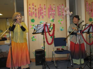 ハワイアン柄のスカート「パウスカート」を着用し、ウクレレとギターの音楽に合わせて