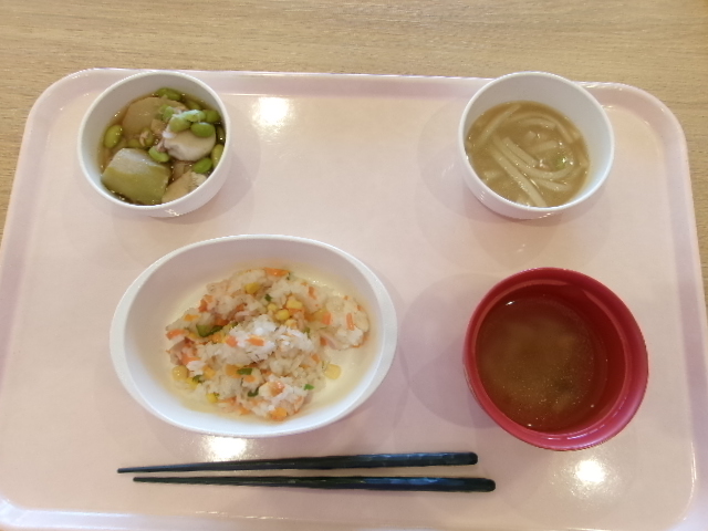 「ピラフ」「さといもと花麩の煮物」「スープ」です。